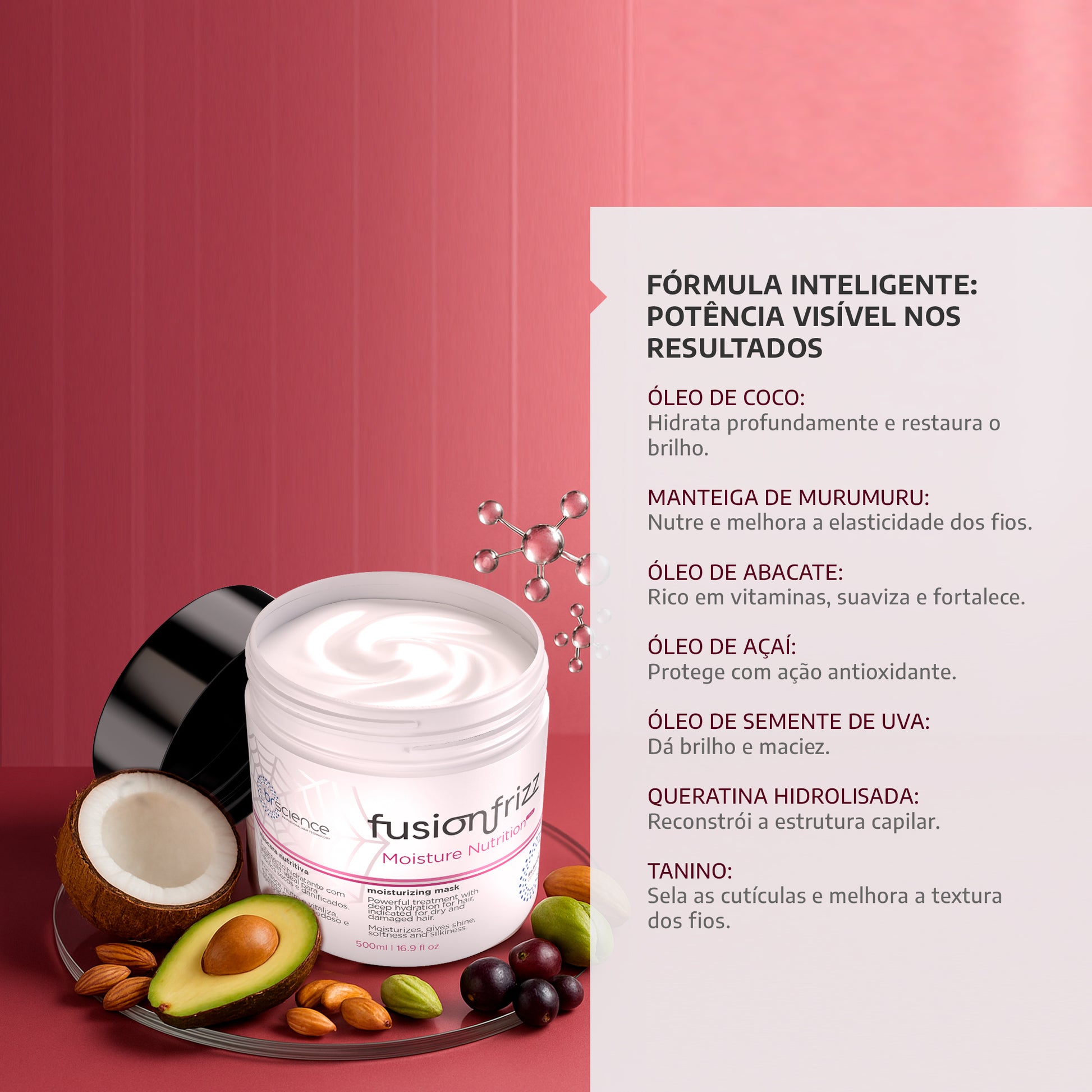 A Fusionfrizz Moisture Nutrition é uma máscara de nutrição intensa desenvolvida para revitalizar e nutrir profundamente cabelos secos, desnutridos e sem vida. Com sua exclusiva fórmula de efeito teia, facilita a aplicação e proporciona uma ação nutritiva poderosa que devolve a força, elasticidade e brilho aos fios. Enriquecida com tanino, queratina hidrolisada e óleos essenciais como óleo de coco, essa máscara garante nutrição prolongada e hidratação profunda, promovendo cabelos mais fortes, maleáveis e saudáveis.