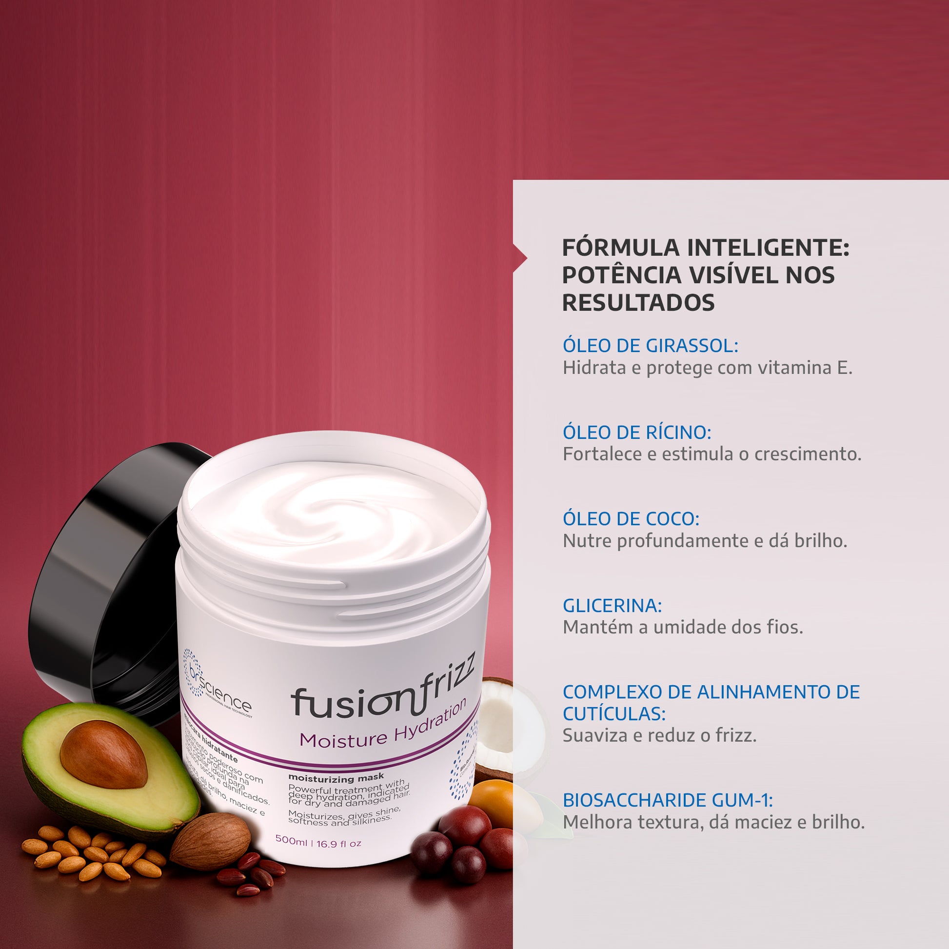 A Fusionfrizz Moisture Hydration é uma máscara hidratante poderosa, desenvolvida para fornecer hidratação profunda aos cabelos secos e ressecados. Enriquecida com tanino, queratina hidrolisada e óleo de abacate, esta máscara age diretamente na fibra capilar, recuperando a saúde dos fios e devolvendo brilho, maciez e elasticidade. Sua fórmula avançada restaura a vitalidade dos cabelos, tornando-os mais suaves, sedosos e maleáveis desde a primeira aplicação.