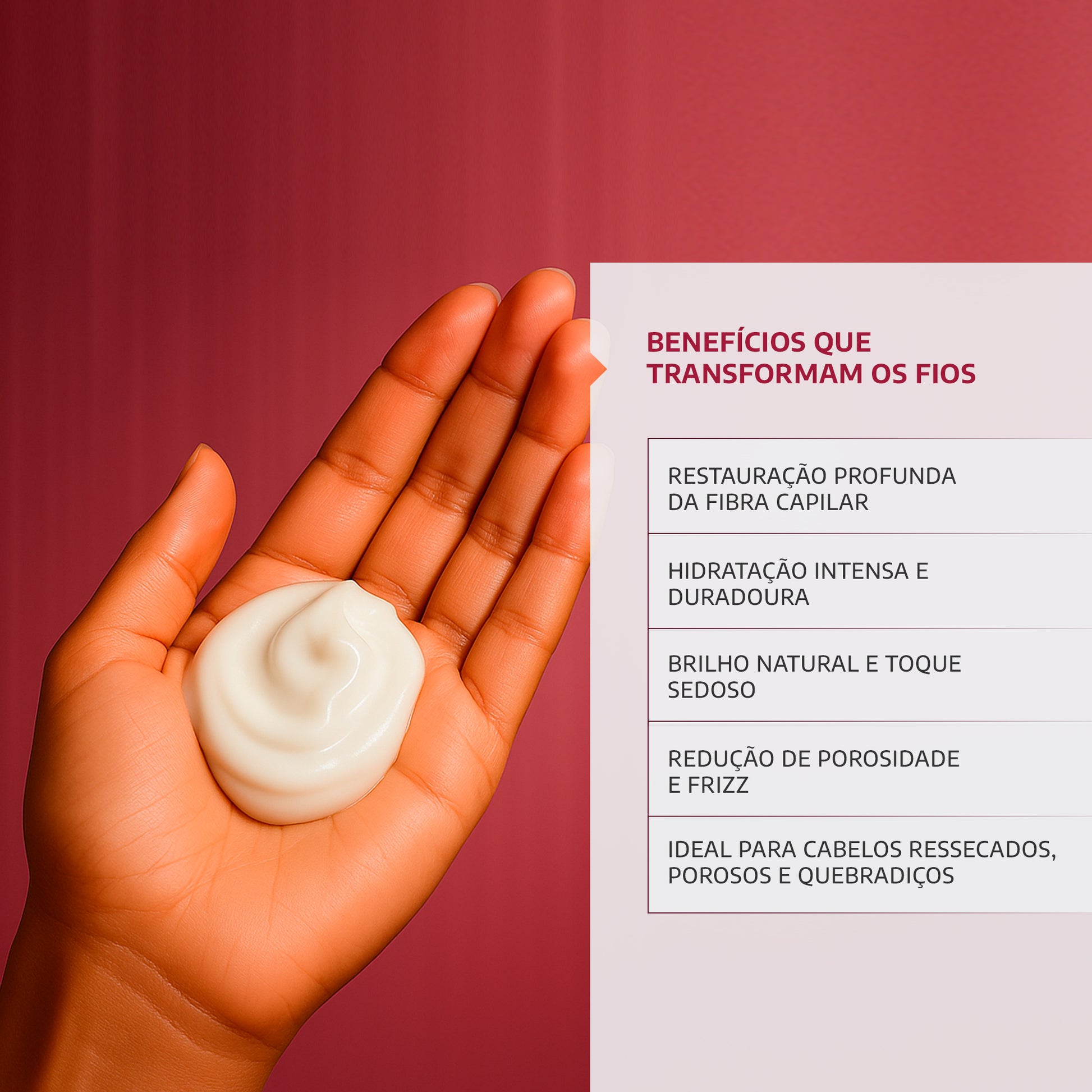 Hidratação Intensa: Proporciona hidratação profunda aos fios, recuperando cabelos secos e ressecados.