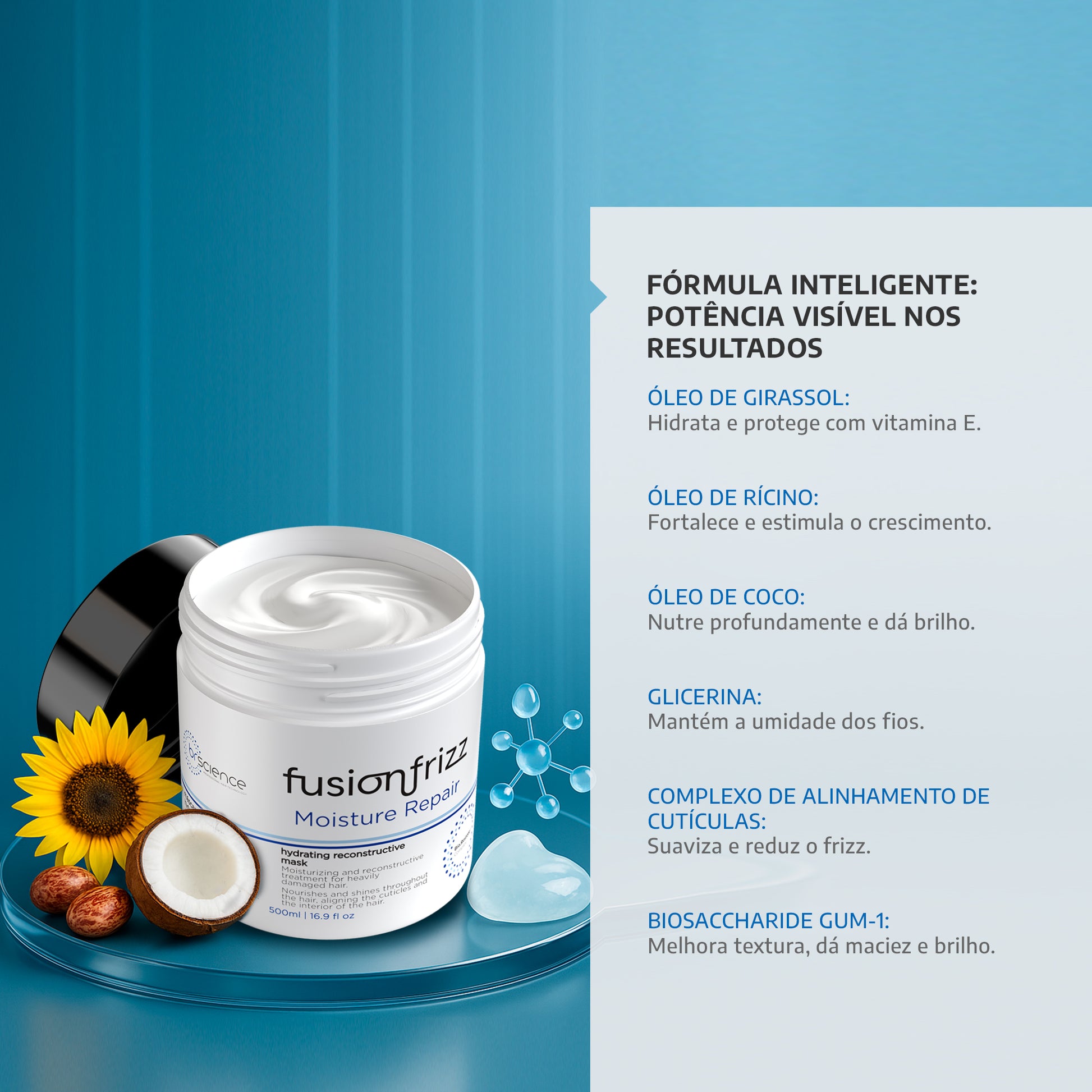 A Fusionfrizz Moisture Repair é uma máscara capilar de tratamento profundo, especialmente desenvolvida para restaurar cabelos danificados e porosos. Sua fórmula rica em ativos reconstrutores penetra profundamente na fibra capilar, nutrindo todas as camadas e revitalizando os fios da raiz às pontas. Esta máscara reconstrói a estrutura interna dos cabelos, alinhando as cutículas e proporcionando maciez, brilho e resistência, tudo em um único tratamento.